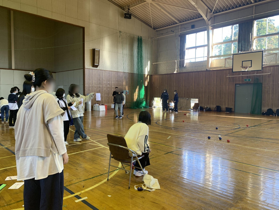 (体育)ボッチャというスポーツに挑戦。初めて組んだチームとは思えないくらい協力しながら作戦を練って楽しんでいました!