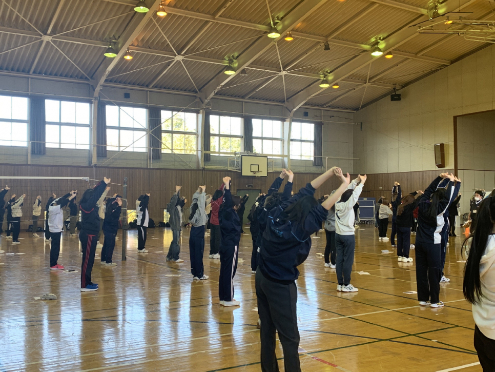 体育の授業の様子です。関節を伸ばし、しっかり準備運動を行います。