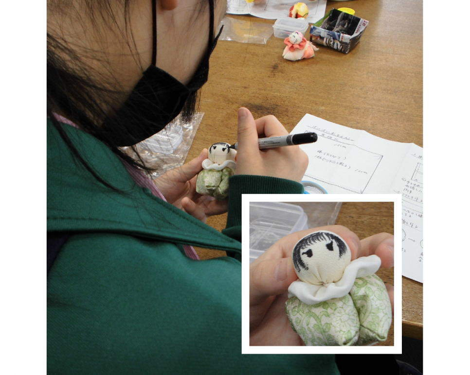 「吊るしびな作り」の体験学習の様子です。最後の仕上げで顔を描いているところですね。この後どんな表情になっていくのか楽しみですね♪