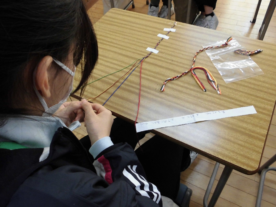 「織り編みミサンガ作り」の体験学習の様子です。自分で選んだ5色の糸を丁寧に編んでいくので想い入れのある作品になりそう☺