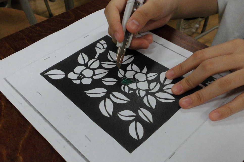 素敵なお花の切り絵です。細かい所も慎重に切り取っていきます。
