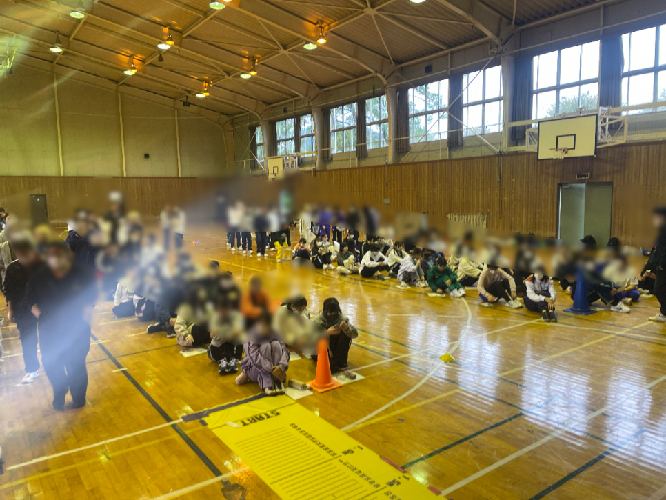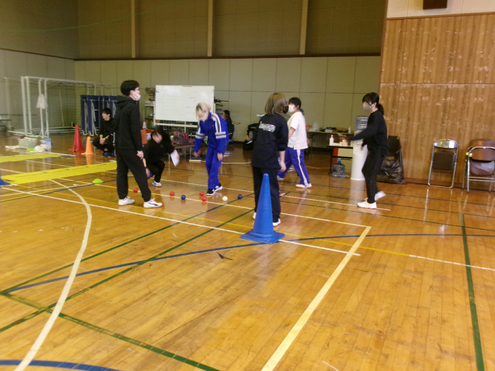 チーム分けをしてぼっちゃで対戦し結果を全員で確認しています。結果に一喜一憂する生徒たちの声が体育館に広がっています。