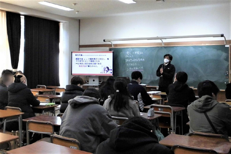 日本史探究の授業の様子です。女性と政治の歴史をテーマに、邪馬台国の卑弥呼について学んでいました。