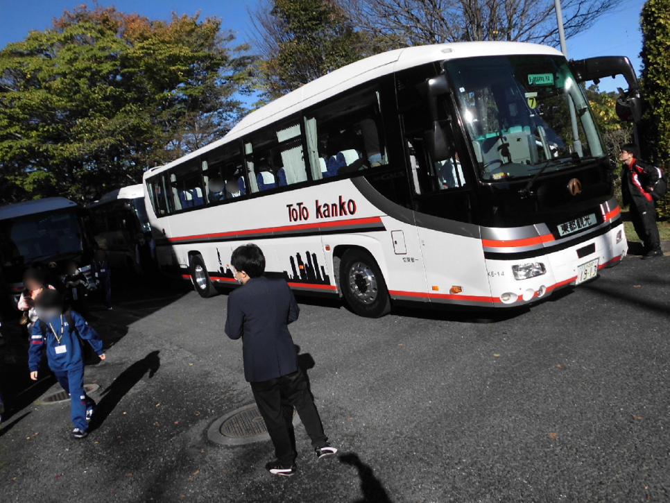 宿泊施設から本校にバスが到着しました!朝はすっかり寒くなり、段々と冬の気配を感じる季節になってきました。