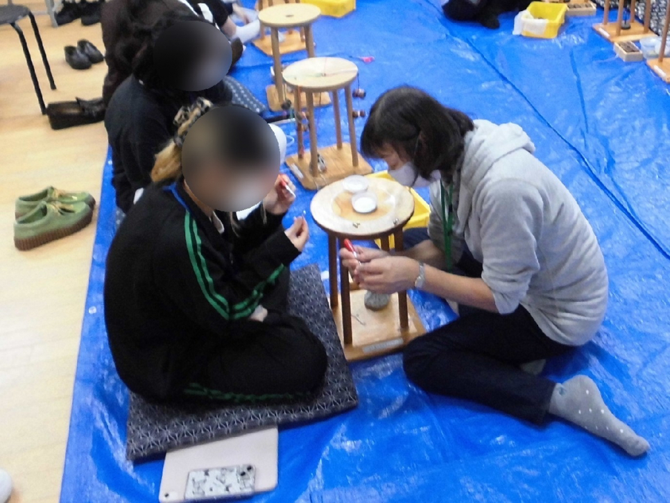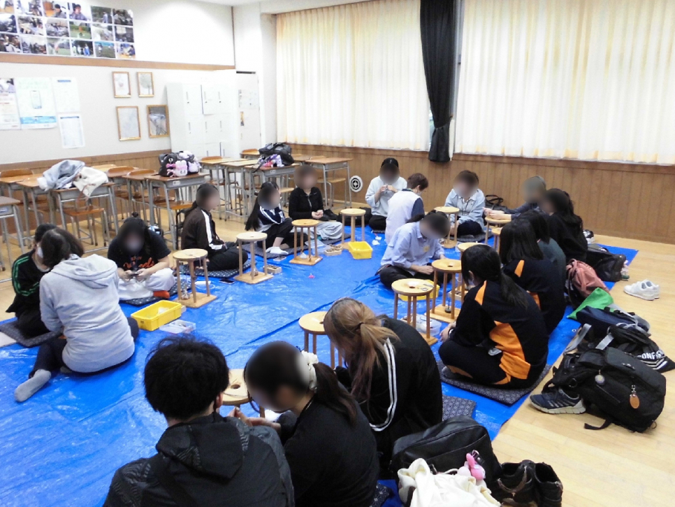 体験学習「組み紐」の様子です。講師や友達と談笑しながら学習に励みます。