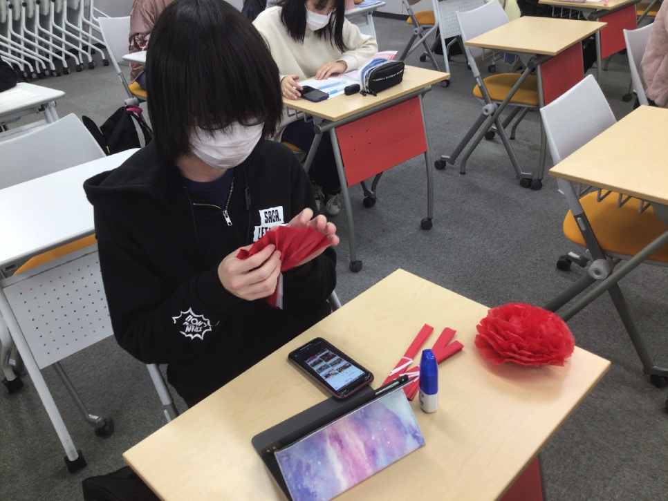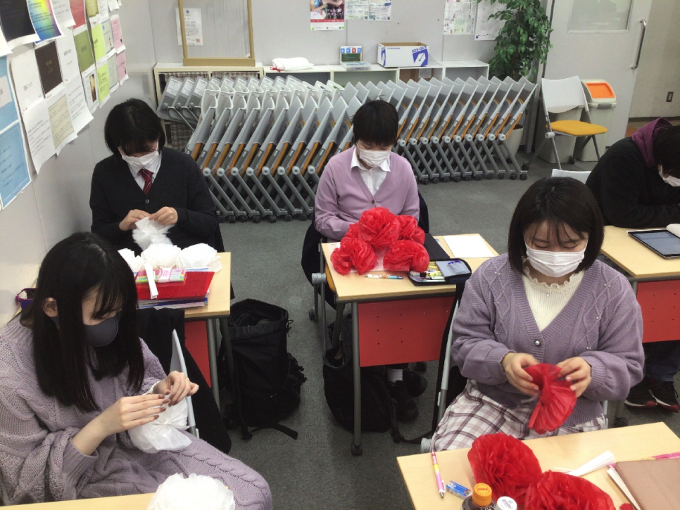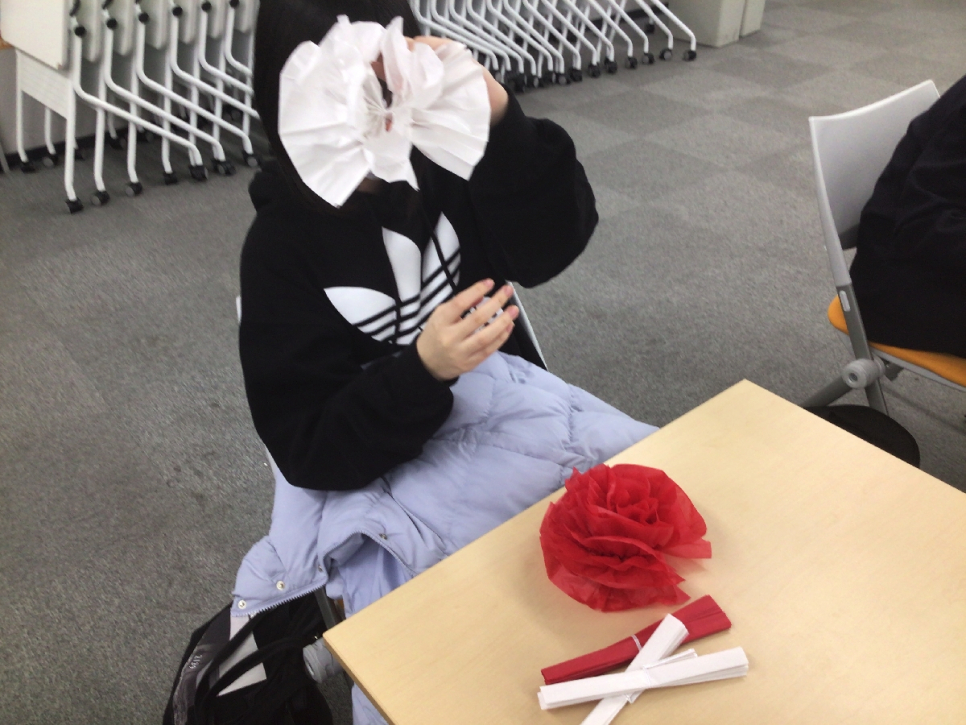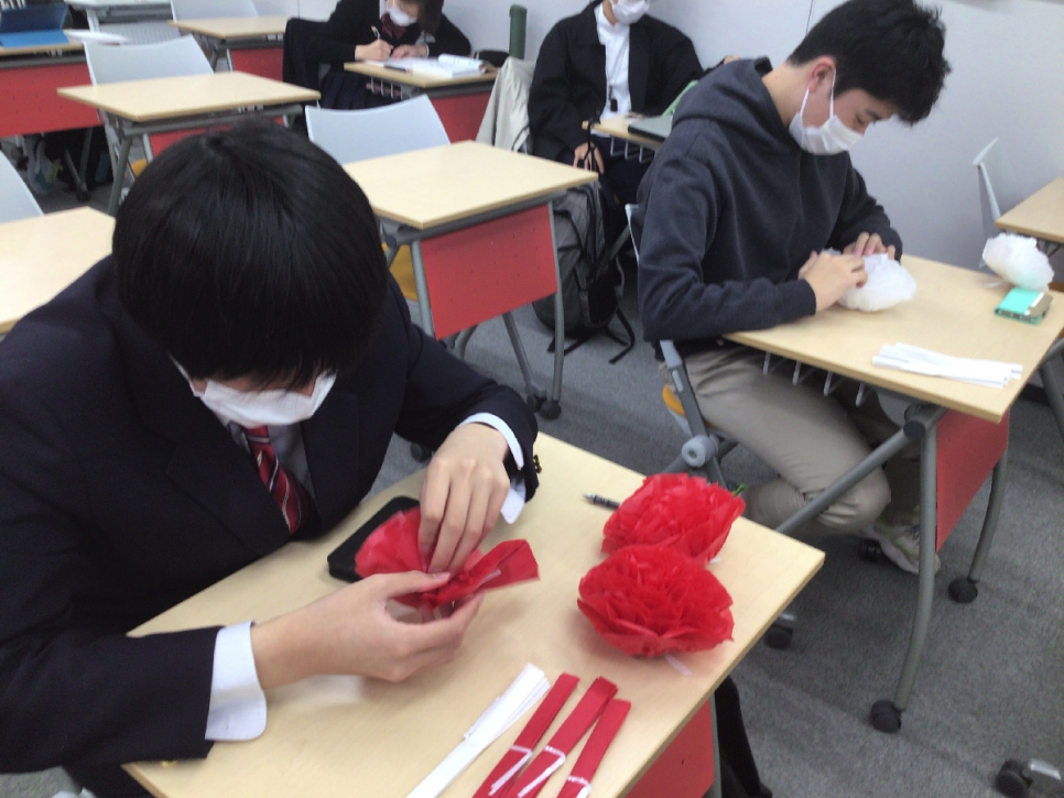 在校生はコロナ禍で卒業式への参加ができませんが、卒業生への餞として紅白花の作成をしてくれました。