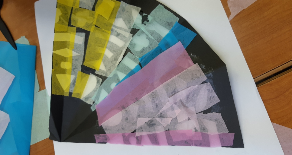 お花紙を自分の好きなように切って、貼り付けていきます。
