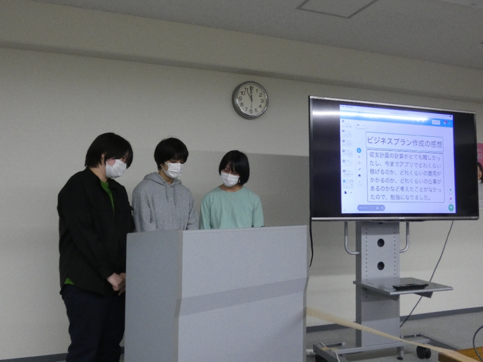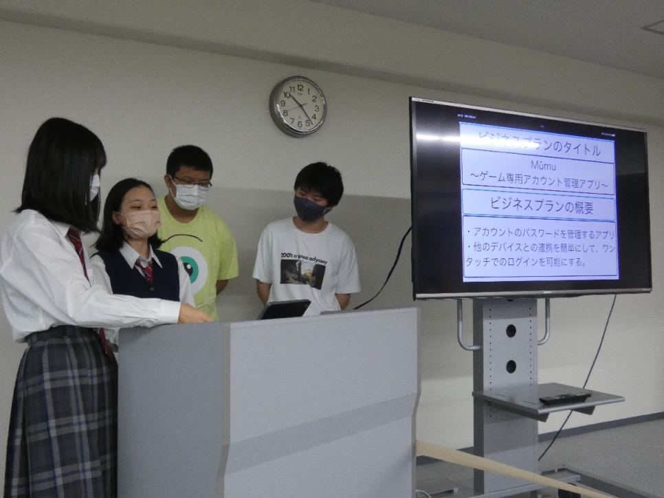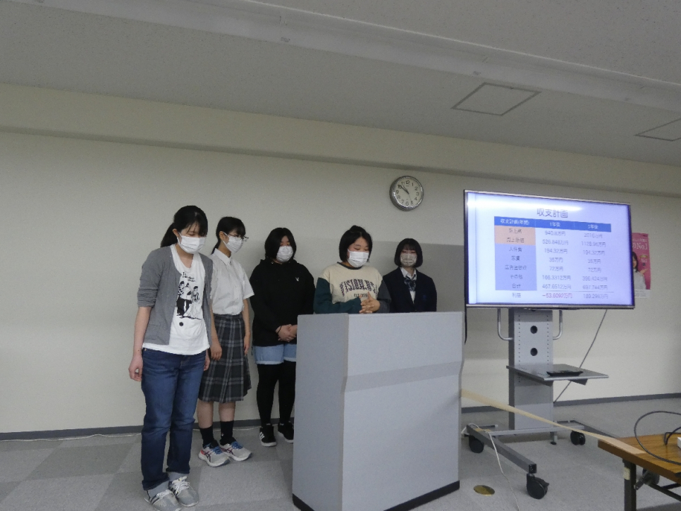 今年度はPBL(Project Based Learning)の取り組みとして5月から日本政策金融公庫さんと連携しながら取り組んできた「高校生ビジネスグランプリ」に出品したビジネスプランを各グループで発表してくれました。