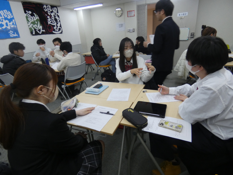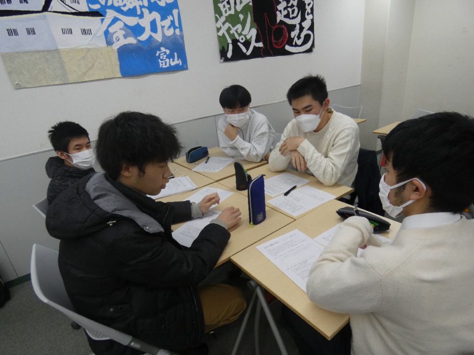 富山キャンパスでは生徒が自主的に考え動くことができるように、一つの議題について意見を出し合うGWT(グループワークタイム)を行っています。