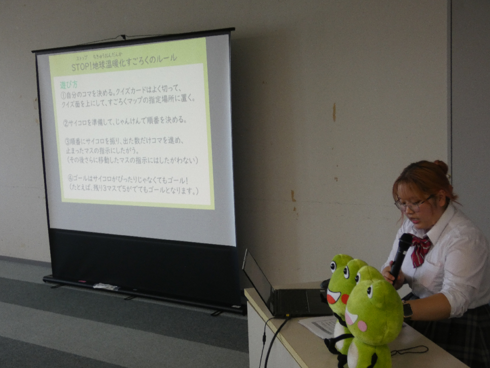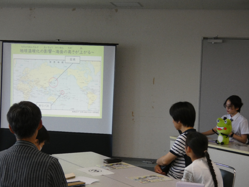 小学生と保護者の方が多数参加しており、緊張する中、前に出てスライドを用いて地球温暖化について説明しました。