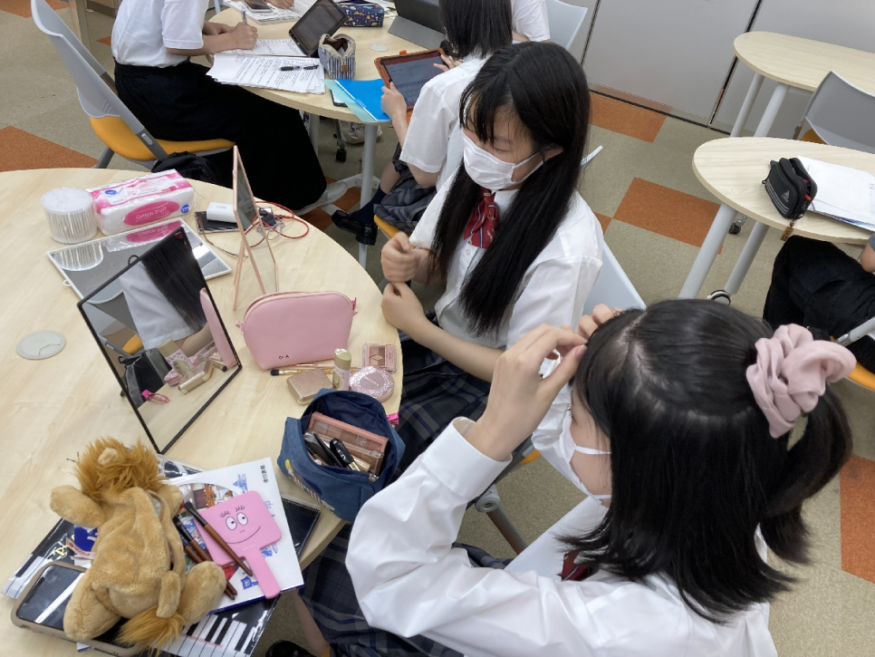 皆でメイクなどの知識を共有したり、調べたり、教え合ったり、ヘアアレンジをしたり、してもらったりと