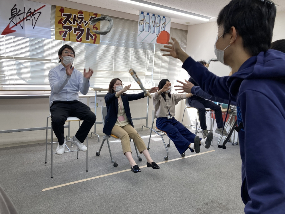 まず驚くのが出し物の多さです。お菓子釣り・ツイスターゲーム・射的・輪投げ・バランスゲーム・ボーリング・たたいてかぶってジャンポンなどなど、そのほとんどがピアサポーターによる手作りのもの!生徒のみんなも何度もチャレンジし、大盛り上がりでした。また、食べ物はたこ焼き・みたらし団子(共に手作りです☆)・からあげが提供され、みんなで美味しくいただきました。