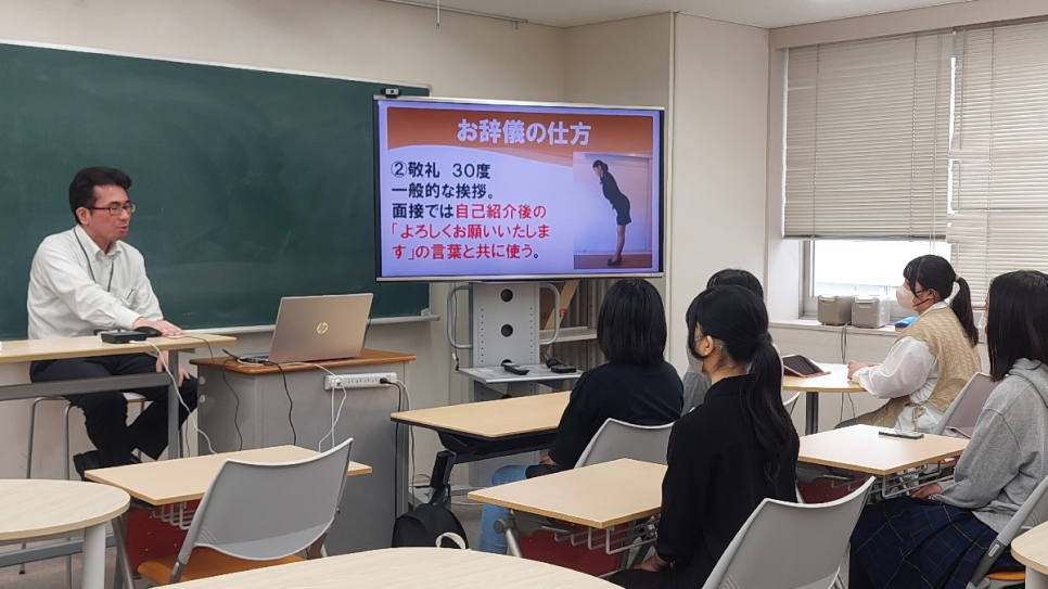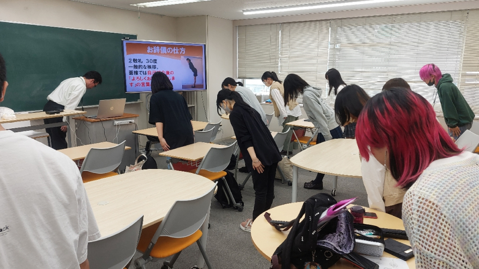 今回は「ファーストインプレッション(メラビアンの法則:人が受ける印象の55%は視覚によるもの)」「身だしなみ」「座り方」「ノックの仕方」「お辞儀の仕方」などの講義を実施しました。