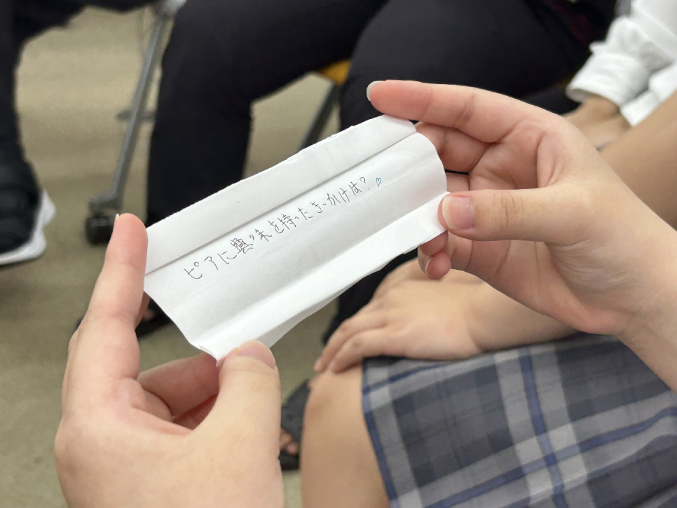 その後は1年生からピアに向けての質問コーナー!1年生が聞きやすいように、よくある質問を書いた用紙を準備し、引いてもらう形式も取り入れました♪大勢の前で緊張しない方法や、月に何回ピアサポ活動してるか?どのような目的をもって活動してるのか、1番楽しいピア活動は? などの質問をもらいました。他にもたくさん質問貰ったよ〜(`・∀・)ノイェ-イ!