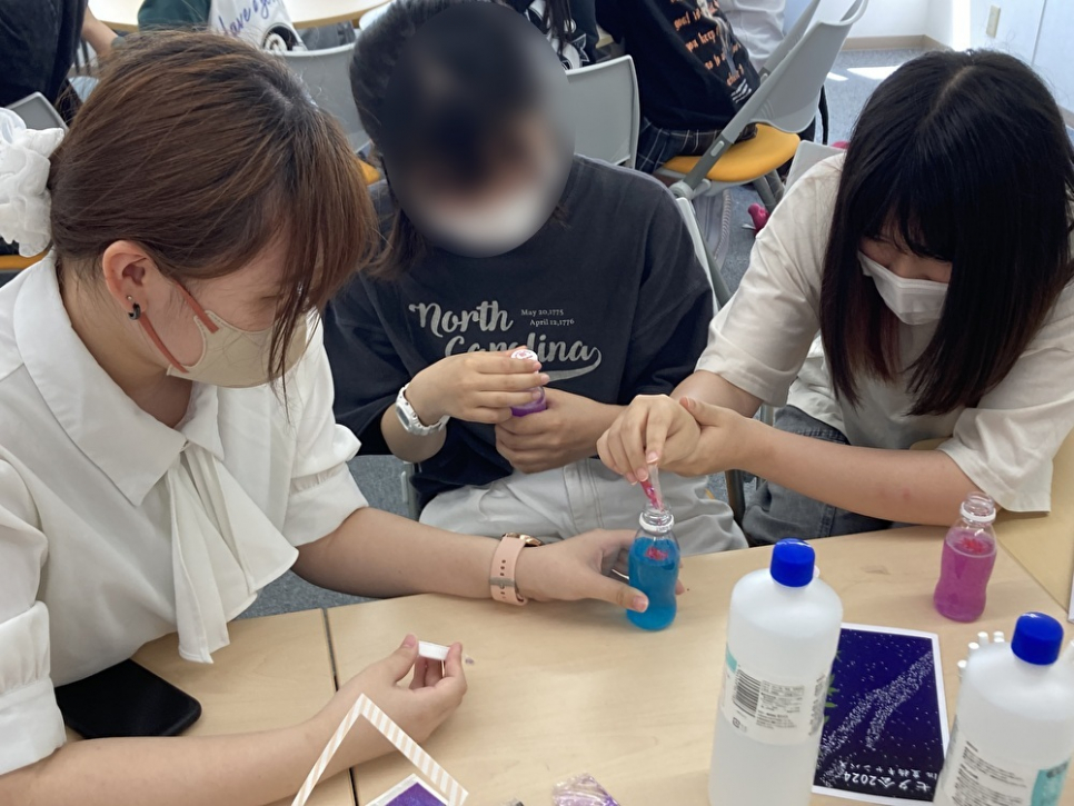 4教室の工作はセンサリーボトルを作りました!(~'ω' )~ユラユラァ- 私は工作のピアで参加者に作り方を教えてたのですが、 材料の洗濯のりが最後のグループの時に足りないというハプニングもありましたが、最後のグループの人達が優しい人たちだったので1本で何とか作れました!感謝(ㅅ´ ˘ `)