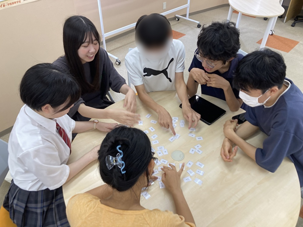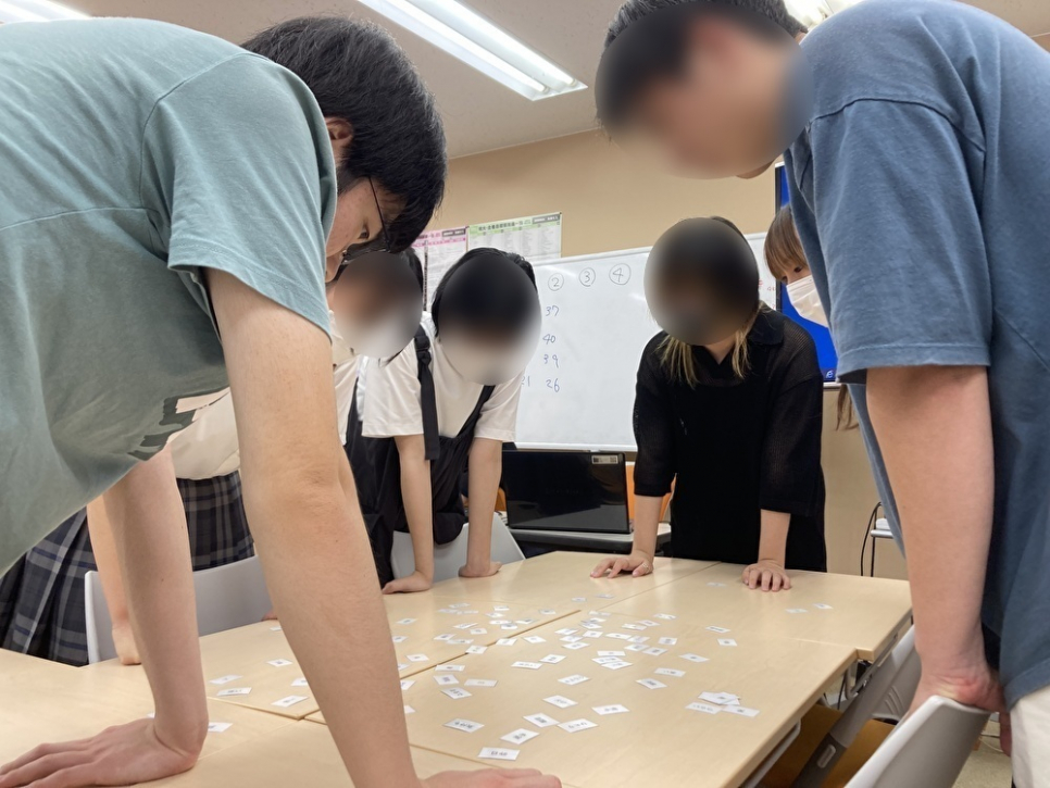 最後に歌詞かるたを行いました。歌詞かるたとは、曲を流し、聞こえたワードのカードをとっていくというゲームです。