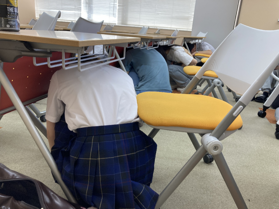 落下物から身を守るために机の下に隠れます。