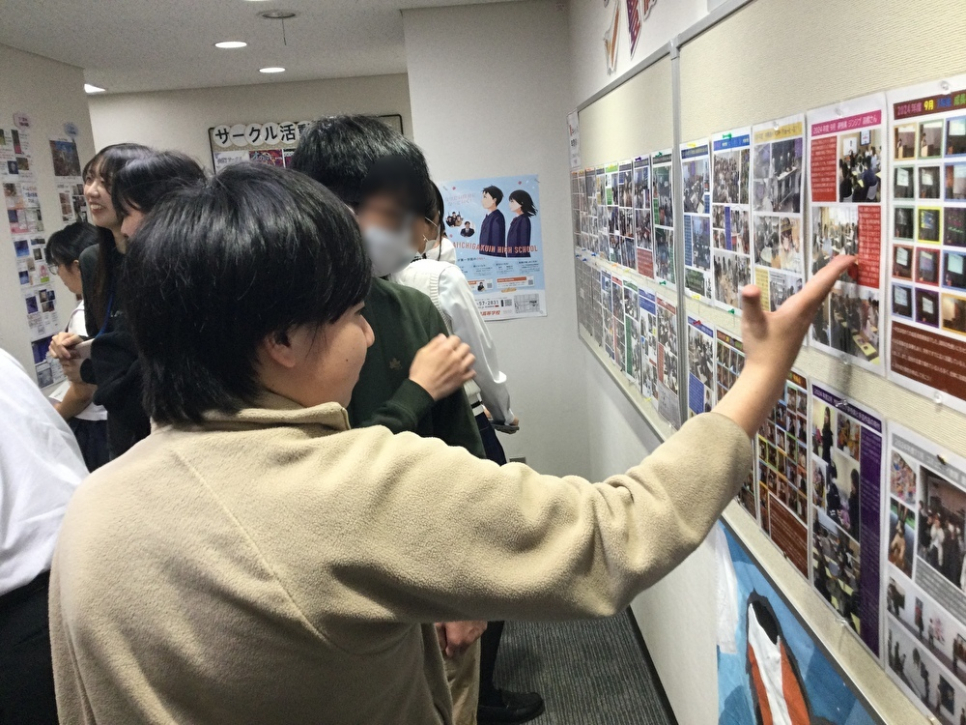 校舎の掲示物を見ながら、ピアサポーターが行事やスクーリングについて説明します♪