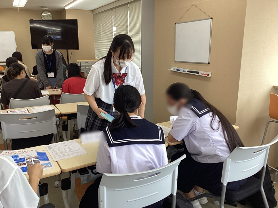 別教室に移動した後、中学生は一人一人につくピアサポーター(在校生)と一緒に行動します。