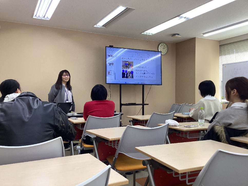 前半はM先生の自己紹介を聞きました。中学・高校・大学生活の過ごし方や、現在のお仕事に至るまでの道のりを話してくださいました。学生時代は友達とわいわい楽しく過ごしていたという話が多く、学校生活を満喫していて羨ましかったです!