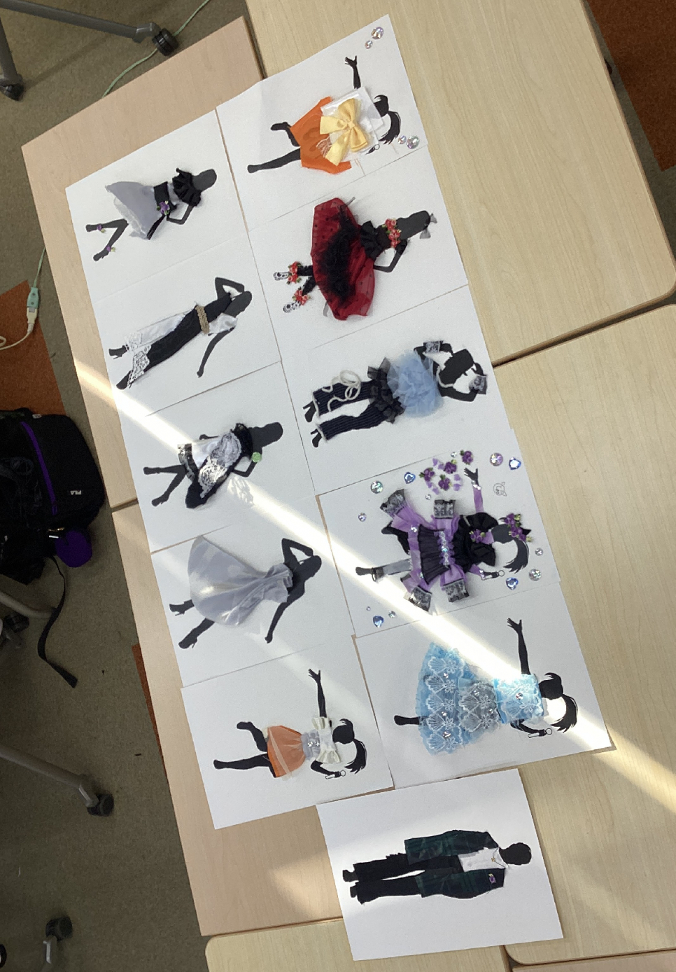 デザイン画コラージュ体験とは、人間の様々なシルエットに、布やボタン、レースやフリルなどの素材をあてがい、質感や色の組み合わせを楽しみながら、自分だけのデザインを形にしていく体験です♪