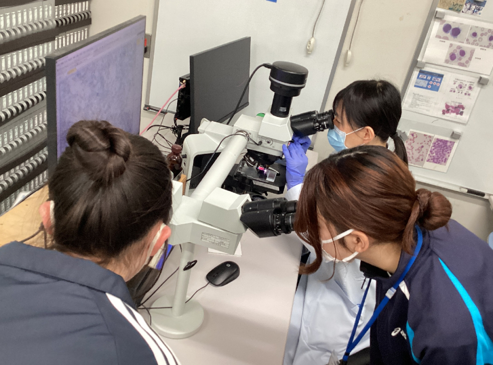 今回は主に「中央臨床検査室」の中を1つ1つ見させていただき、それぞれどんなお仕事をしているかお話してくださいました。実際に顕微鏡を覗いたり、肺活量を測ってみたり、血液検査の仕方を見たりと、初めての体験ばかりでとても興味深かったです!こんなお仕事もあるんだなと知ることができました。