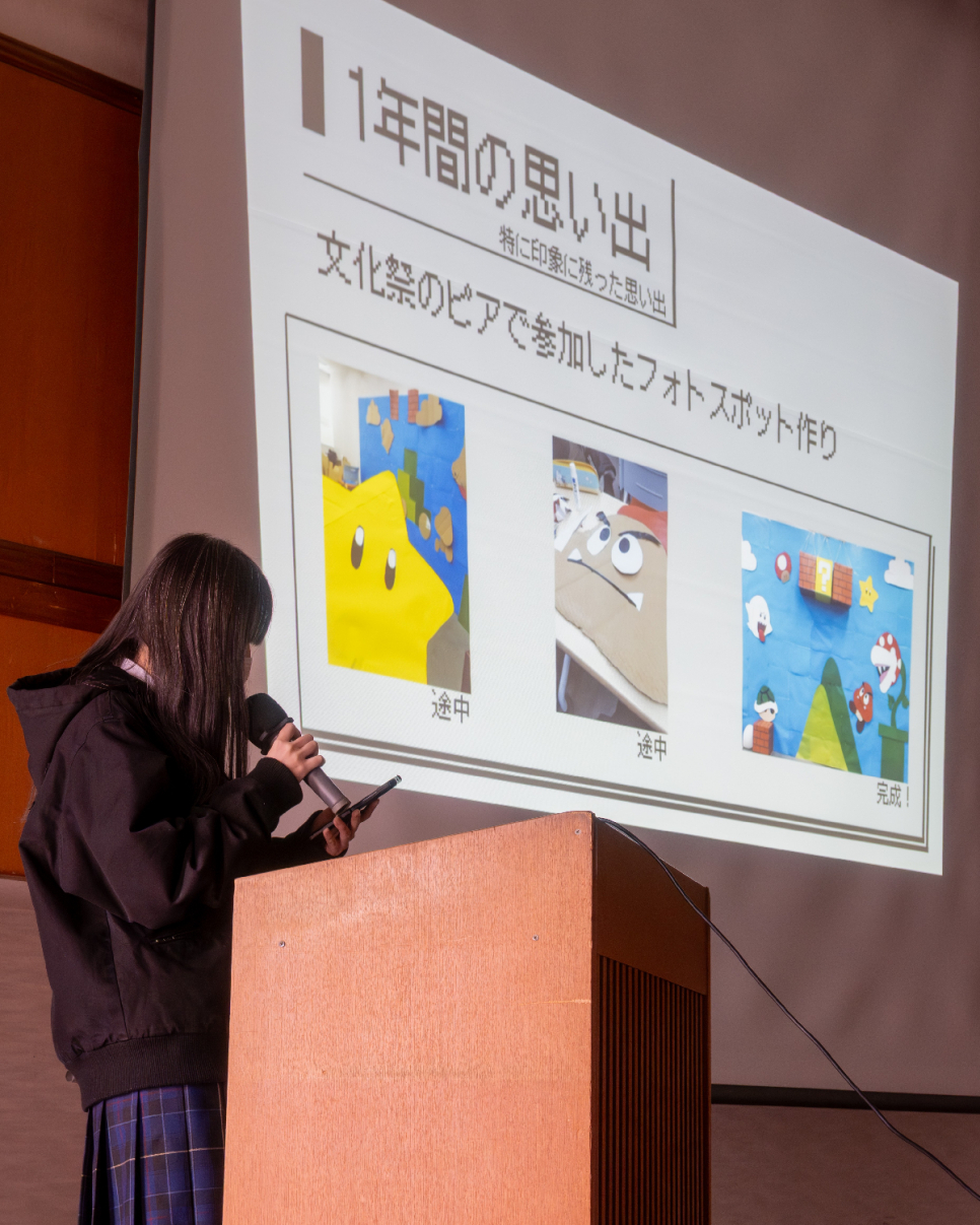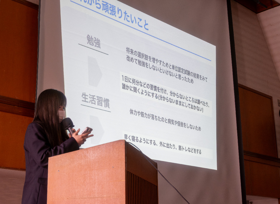 今回の発表では、成長した点や2年生に向けての目標、1年間の思い出などについて発表しました。