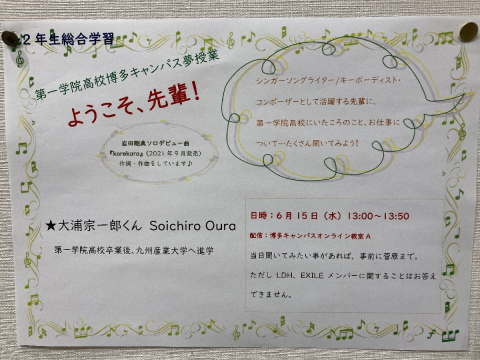 夢授業~ようこそ、先輩!~今日は6/15(水)に行われた夢授業「ようこそ、先輩!」についてご紹介します。 この授業では、第一学院高校博多キャンパス出身で、現在音楽家として活動されている大浦宗一郎さんにお話をしていただきました。ご自身で曲を出されているのはもちろ... -