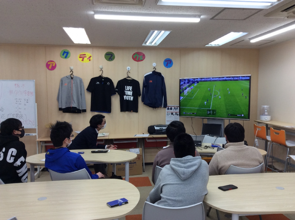 e-スポーツ部(ウイイレ部)では、主にサッカーゲームのウイニングイレブンを使ってサッカーゲームを行います。