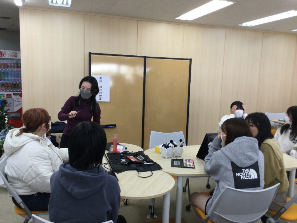 美容・理容の分野では、ヘアスタイリングとメイクの体験を行いました。