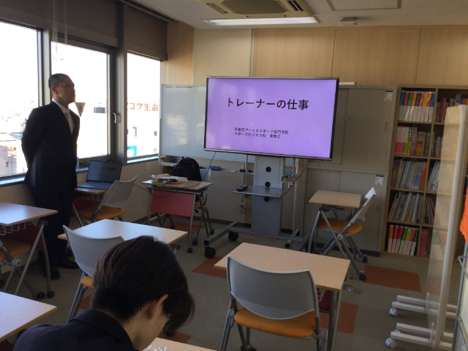 スポーツの分野では、トレーニング指導者お仕事の講義を受けました。
