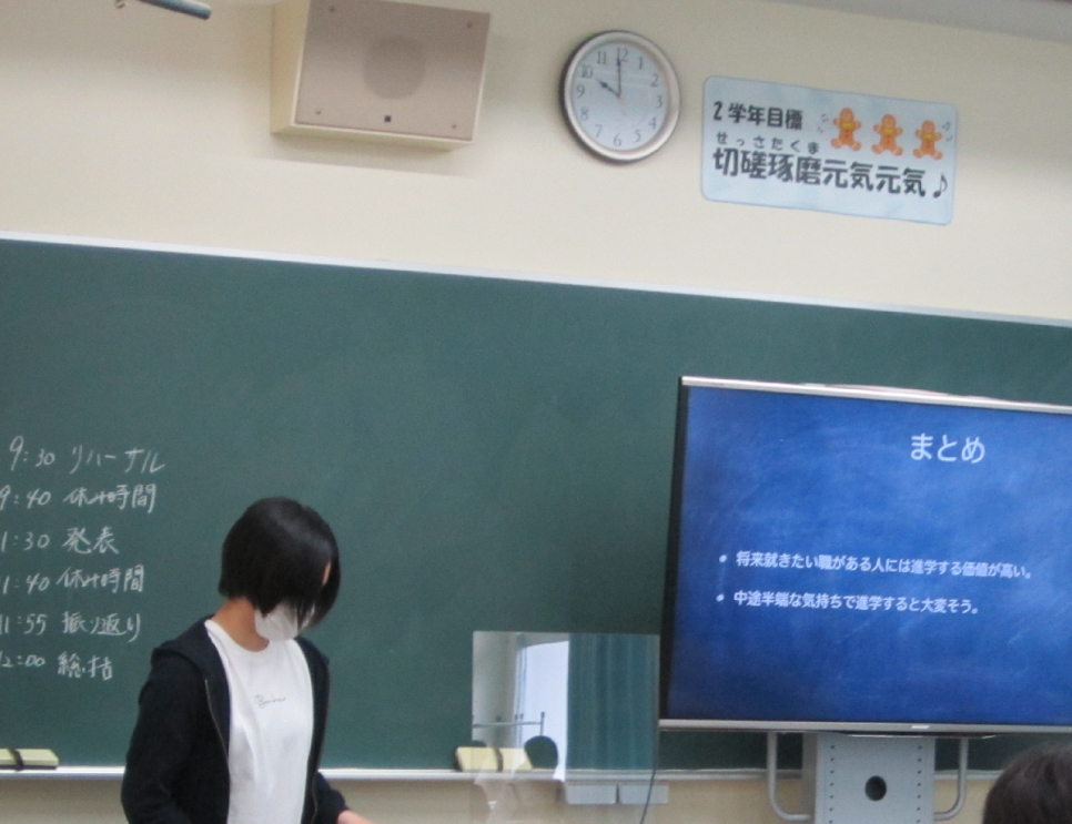成長実感発表会は、生徒が学校生活の振り返りや興味のある分野などについて発表し、