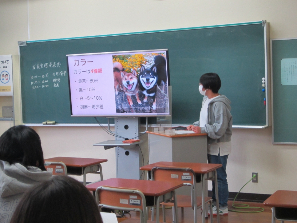 成長実感発表会は、生徒が学校生活の振り返りや興味のある分野などについて発表し、