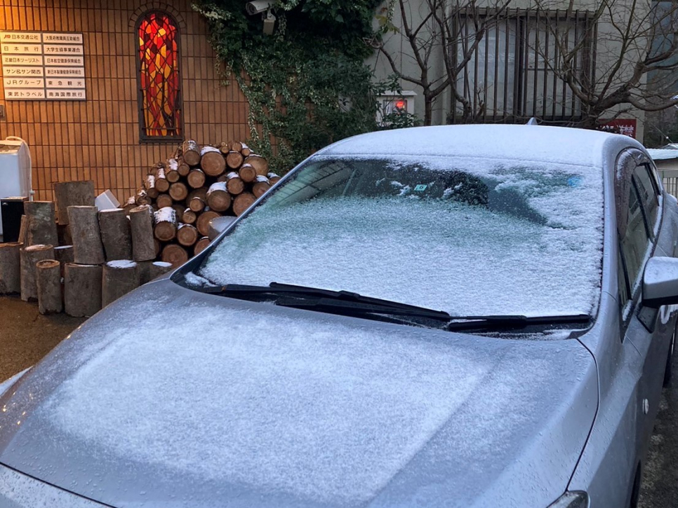 宿舎の前に停めてある車のフロントガラスは凍っていました。