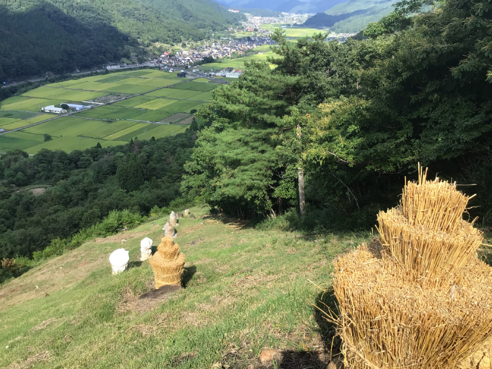 8月21日(金)の今日は、その置きまんどと振りまんど(火を付けて振り回します)を万灯山(まんどやま)の頂上までの持ち上げと設置を行いました。事前の天気予報では最高気温34℃の養父市でしたが、山の上は少しばかりの風が涼しかったです。参加した1年生の生徒6人も熱中症もなく元気に持ち上げてくれました。