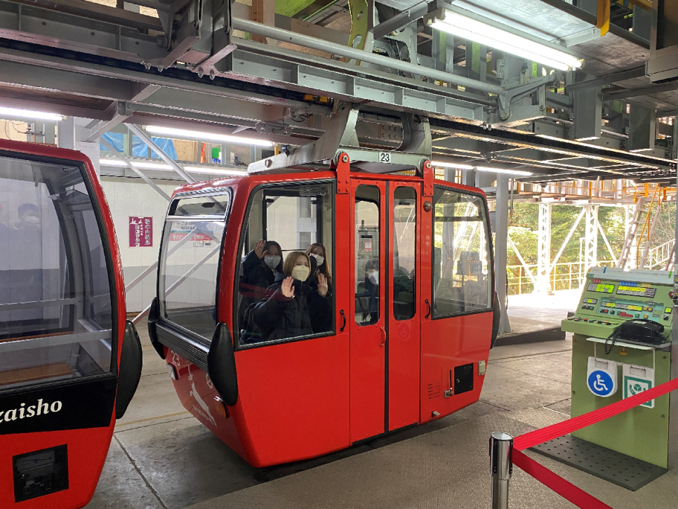 まず近鉄四日市駅に集合し湯の山線に乗り、湯の山温泉駅で集合写真。そしてバスで御在所ロープウェイ駅まで行ってから再び集合写真。そこからロープウェイで御在所頂上まで登りました。