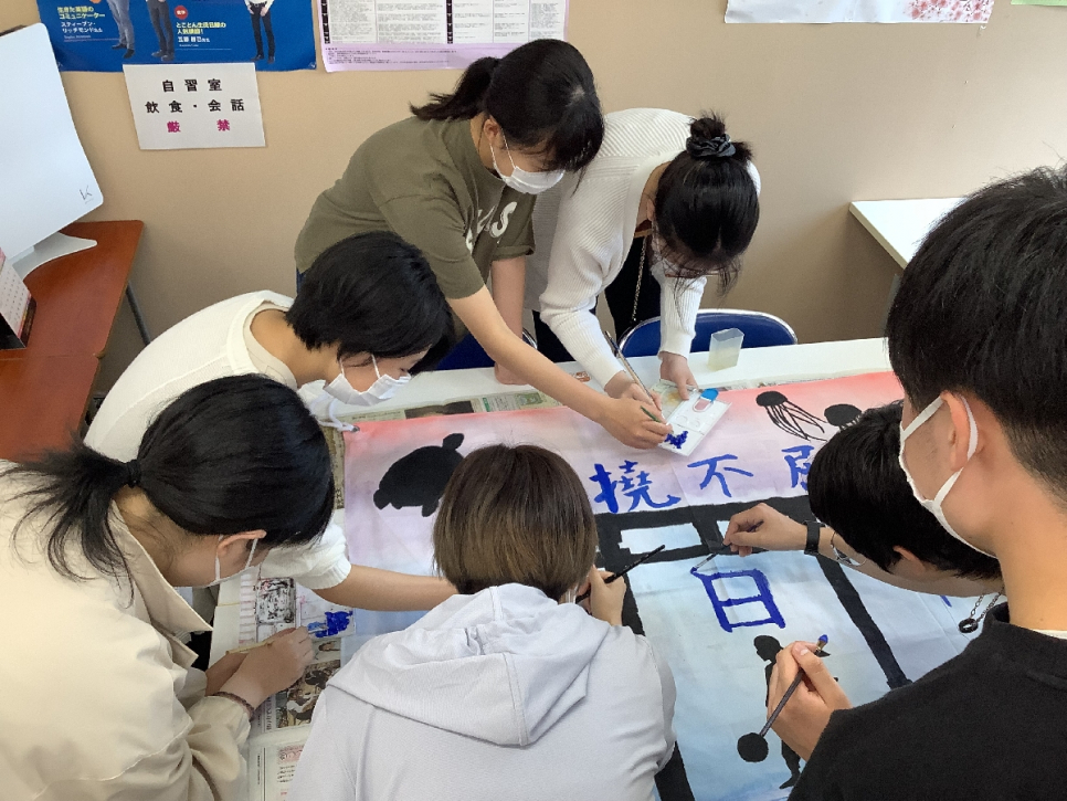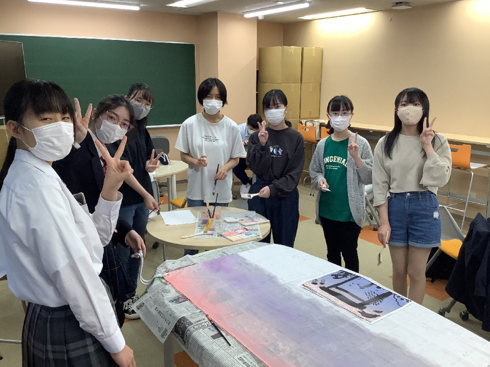 デザインが得意な生徒が想いを形にし、そのデザインを元に下絵を描き、最後は皆で分担して色付けをしました。