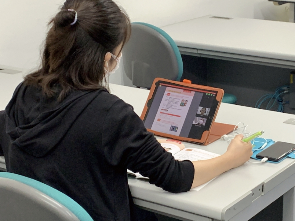 後半はフィリピンの先生とオンラインでつながり、習った表現を使って実際に英語で話します。