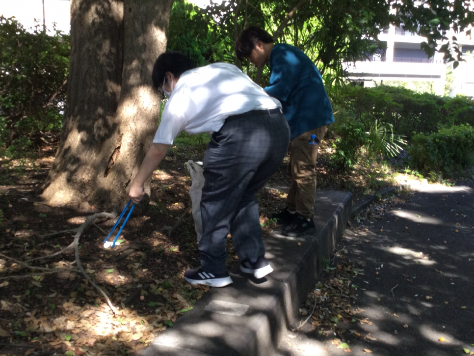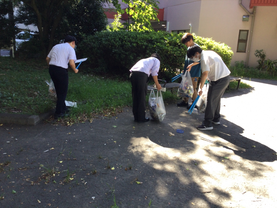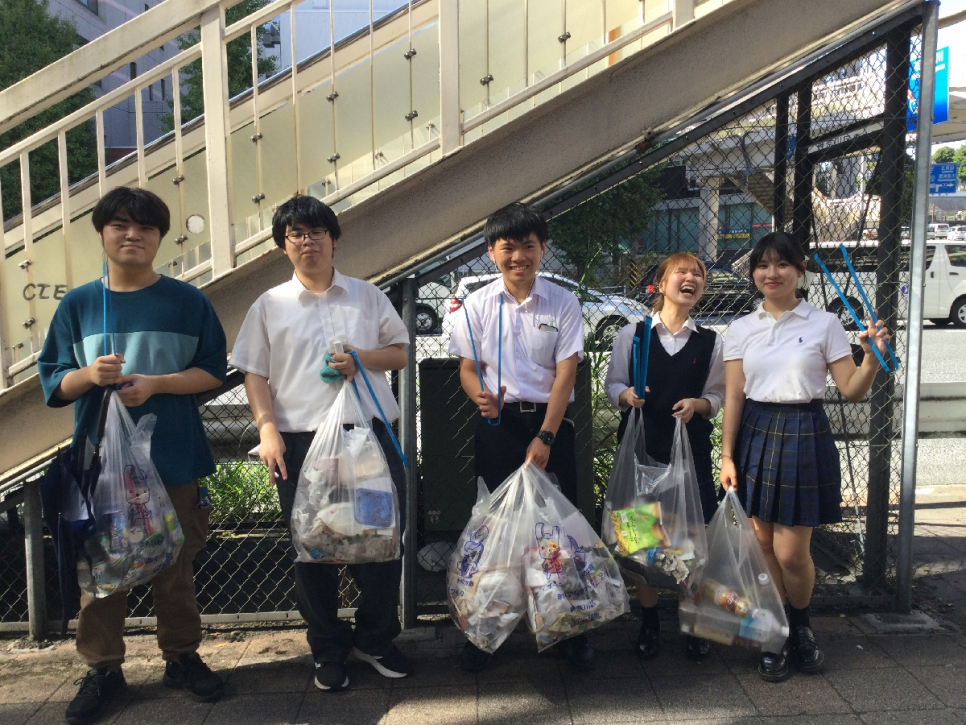 残暑が厳しい中、この日は5名の生徒が参加してくれました!普通にゴミ拾いをするのではなく、拾ったゴミの量を競うスポーツにすることで、仲間と楽しく地域清掃ができています!