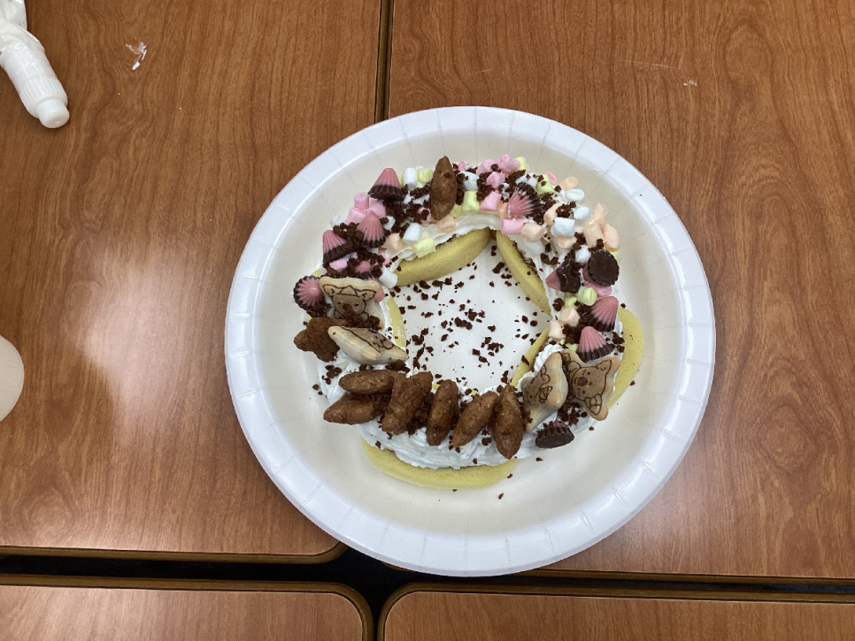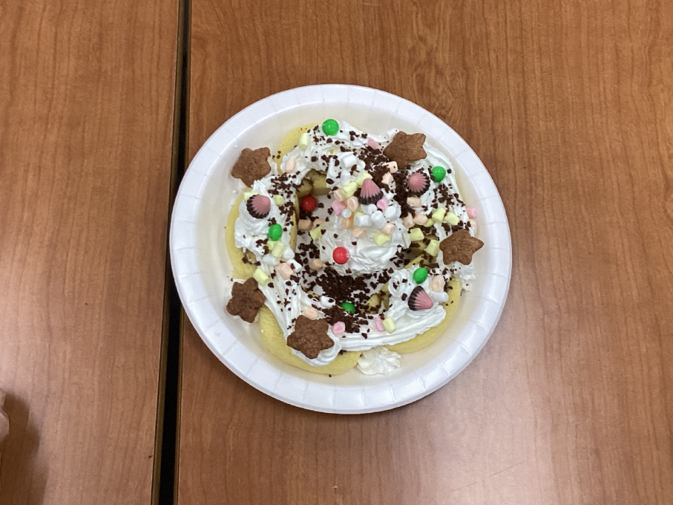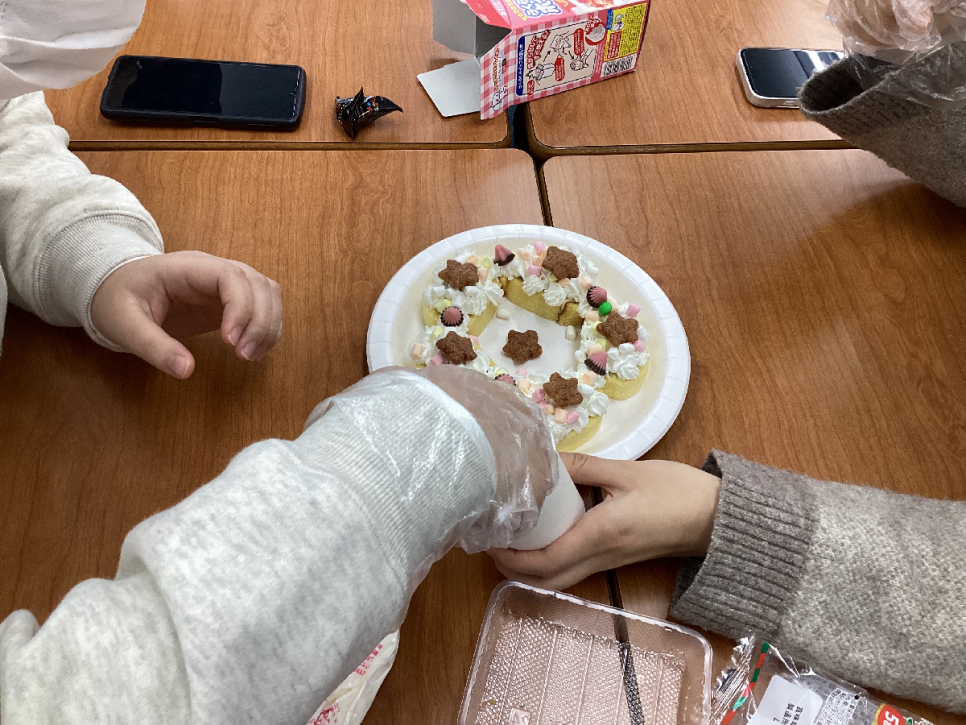 グループでロールケーキやホイップクリーム、お菓子の飾りでリースのケーキを作りました。