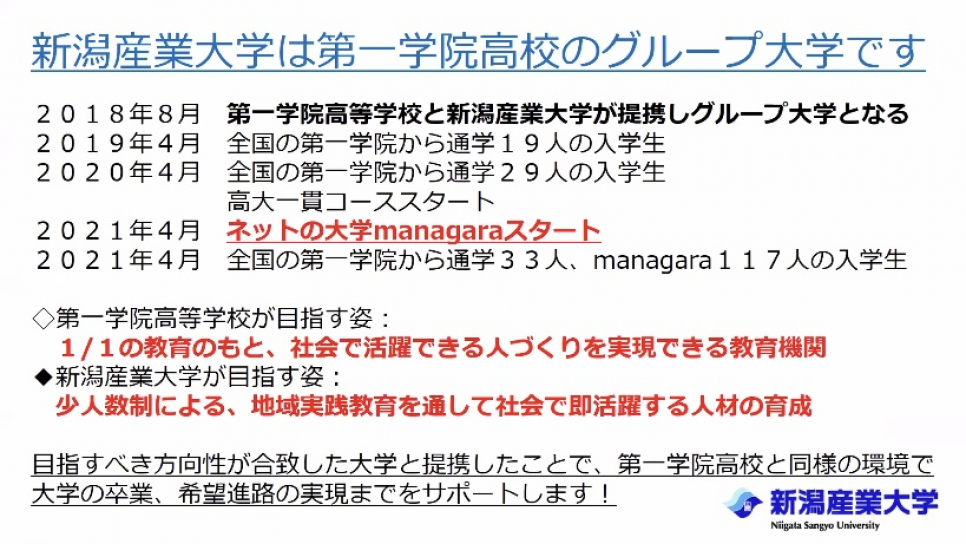 先日のLHRでは、提携している新潟産業大学のオンライン説明会を行いました。