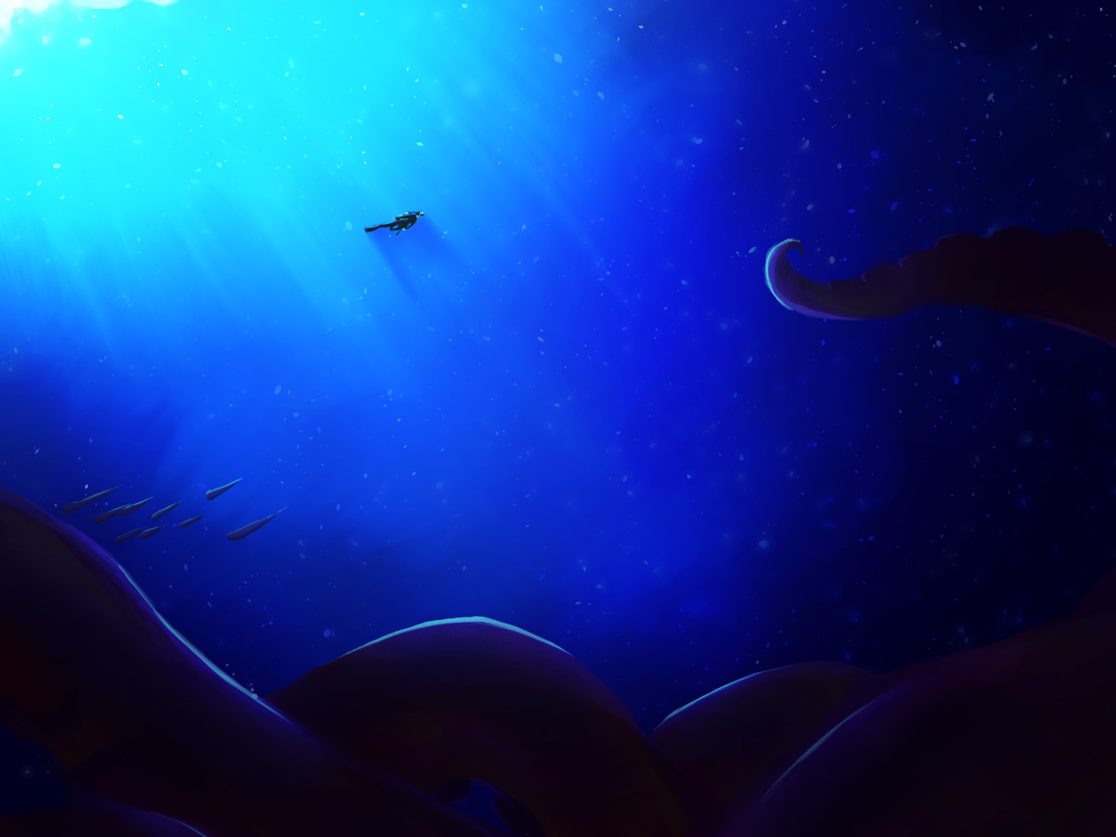 不思議な水滴に誘われて海に沈んだ町の小さな駅に迷い込んだ女子高生の、ひと夏の冒険の始まりをイメージして描きました。