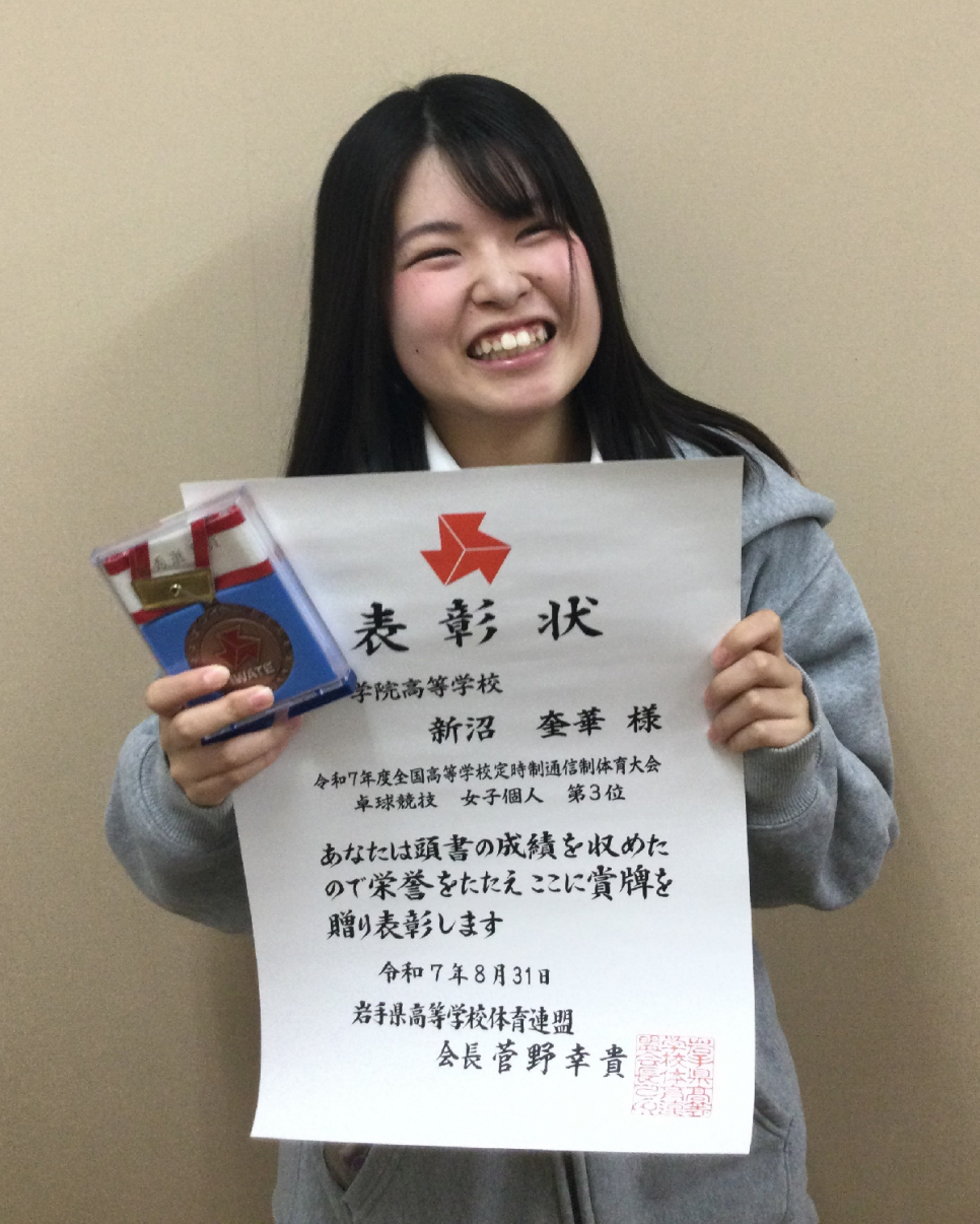 - 盛岡キャンパスの新沼奎華さんが、岩手県高等学校体育連盟より、令和7年の卓球競技 優秀選手として認められました。
