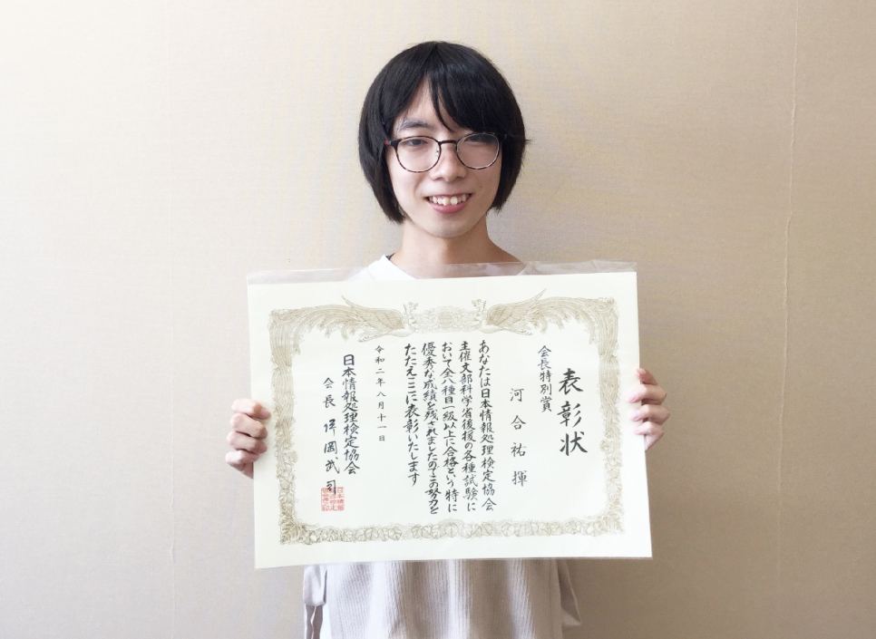豊橋キャンパス3年生 河合 祐揮さんが、日本情報処理検定協会主催(文部科学省後援)の各種検定試験 8種目全てに1級以上認定・合格し、「日本情報処理検定協会 会長特別賞」を受賞しました。