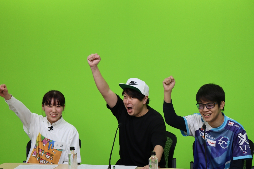 解説でe-sports決勝を盛り上げてくれた吉本興業所属の井上マーさん(中央)とKONAMI e-sportsアンバサダー/DetonatioN Gaming所属の相原選手(右)