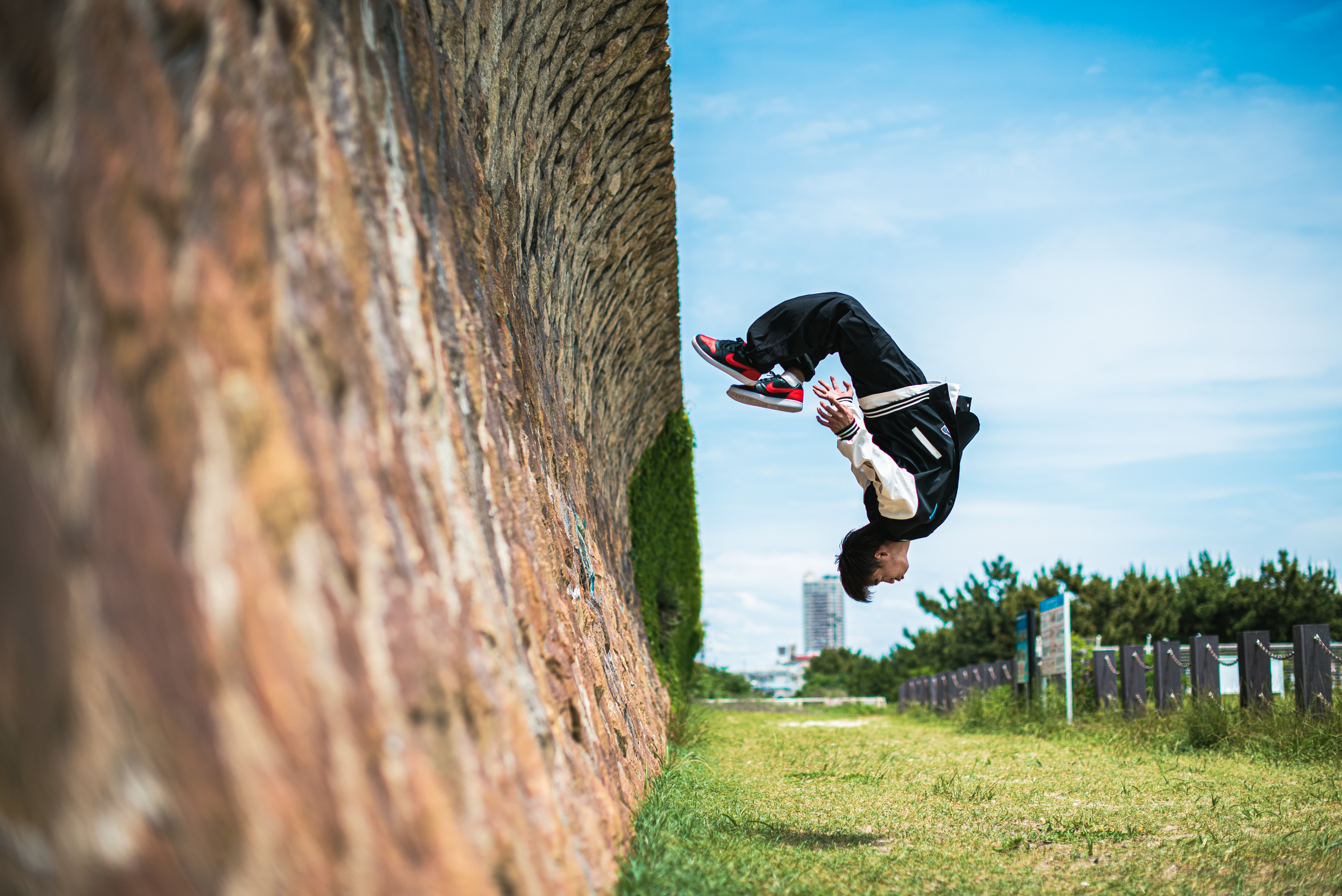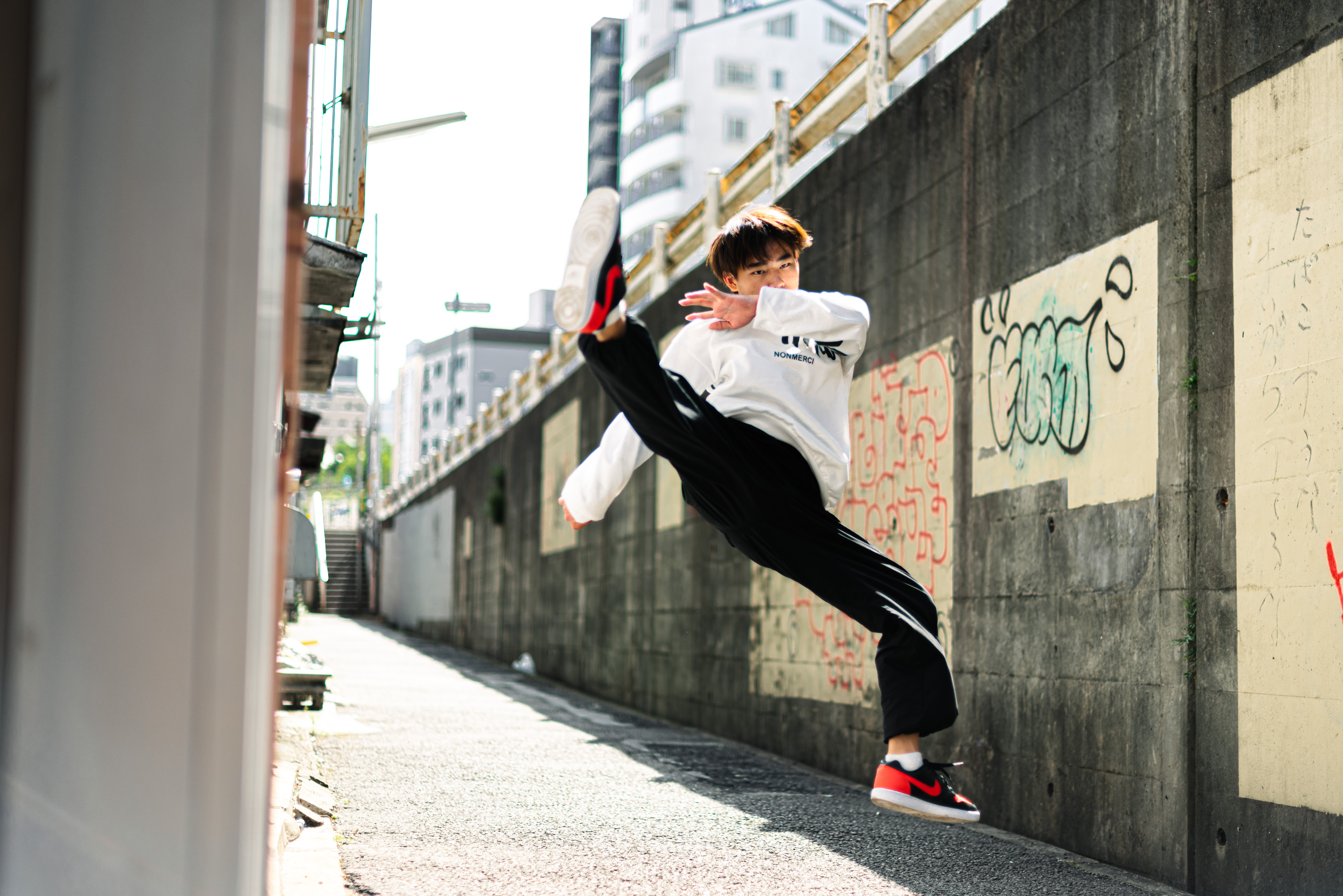 トリッキングに出会ったきっかけは、小さい頃に見ていたドラゴンボールのアニメです。悟空のアクロバティックな動きに憧れて、「僕も悟空のように自由に飛び回りたい!」と思い、体操教室に通い始めました。教室のカリキュラムの中にトリッキングのクラスがあって、見ているうちに動きに興味が湧き、レッスンを受けることにしました。トリッキングはストリートカルチャーなので、「いかに格好よく見せるか」を考えます。そこが僕に合っていると思っています。