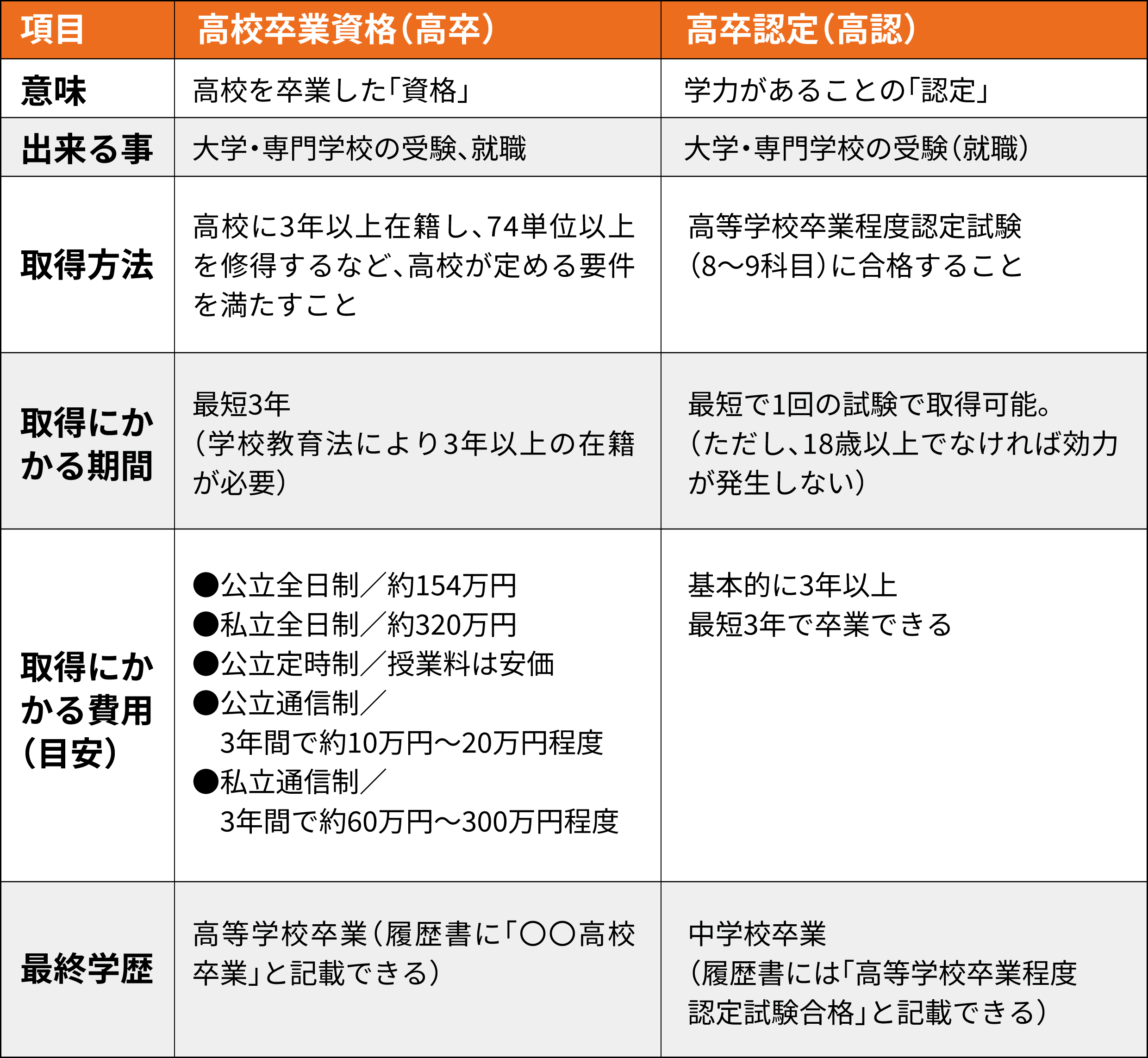 上記の表からわかるように、高校卒業資格と高卒認定の最も大きな違いは、取得後の「最終学歴」にあります。