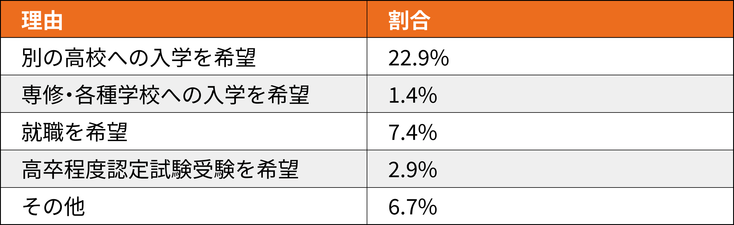 そのほか、病気やけが、家庭の事情、経済的な困難、問題行動なども理由として一定数存在します。割合は少ないものの、背景には長期的な療養や家庭環境の変化など深刻な事情が隠れていることもあります。