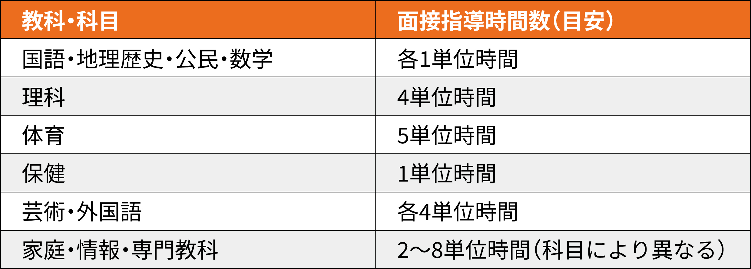 以下は、文部科学省が定める教科ごとの面接指導時間の目安です。